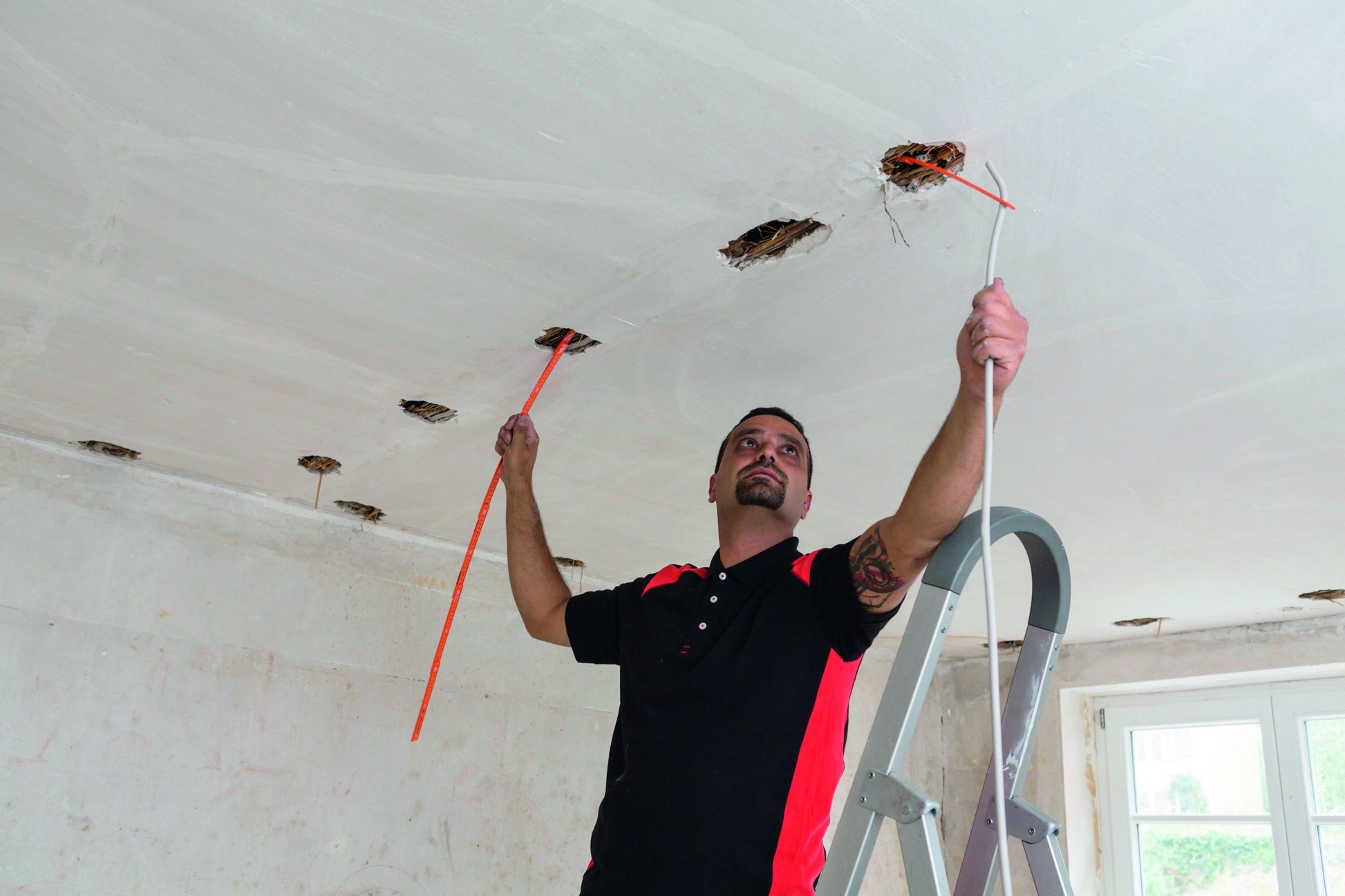 Zum Abmessen und Markieren der Abstände von Unterputzdosen sowie Einziehen von Kabeln bei der Elektroinstallation.